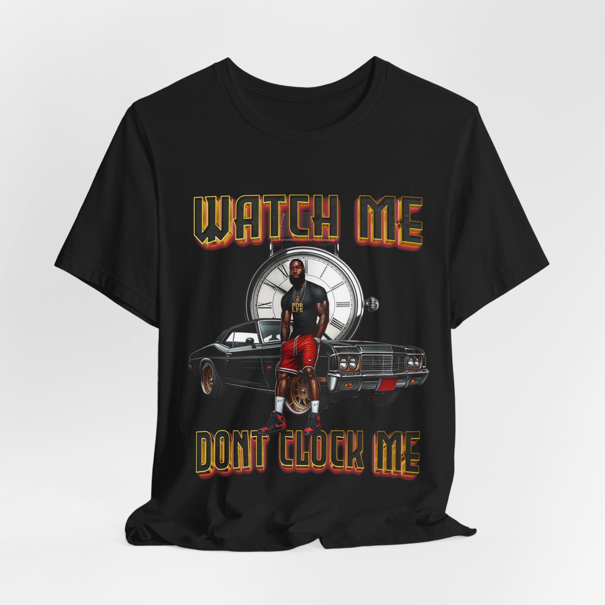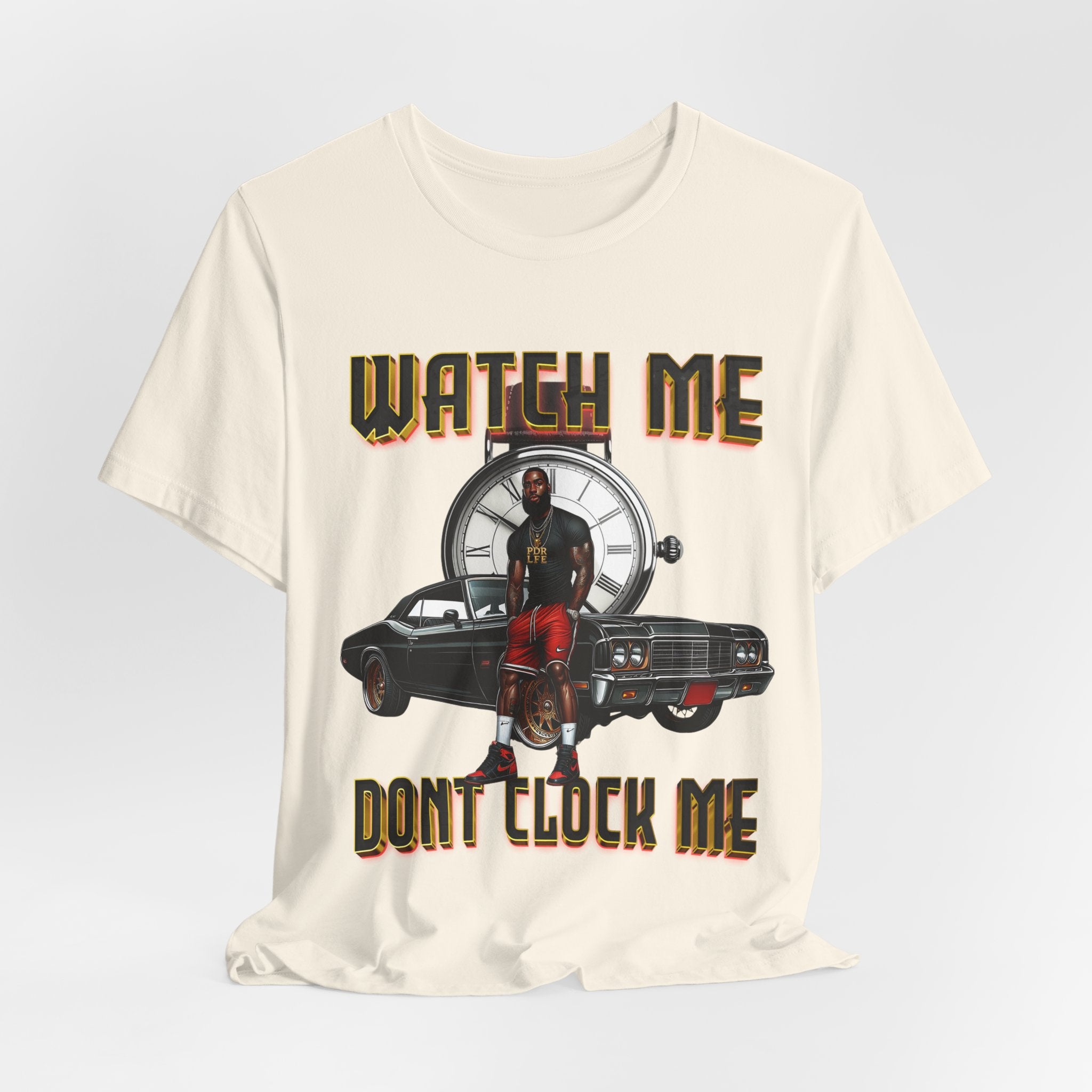A breathable, soft cotton tee that carries attitude and story. The shirt features a bold front graphic of a poised figure leaning on a classic lowrider with a large clock motif behind them and the words “WATCH ME / DON'T CLOCK ME” in a vintage-styled type. Lightweight Airlume combed and ring-spun cotton keeps you comfortable from day to night, while the retail crew neck and side seams hold a crisp shape for layering or wearing solo. Every detail — from ribbed collar and shoulder tape to a tear-away label — is built for everyday wear with a clean, finished look. Ethically made and REACH certified, this tee blends streetwise style with responsibly sourced construction.