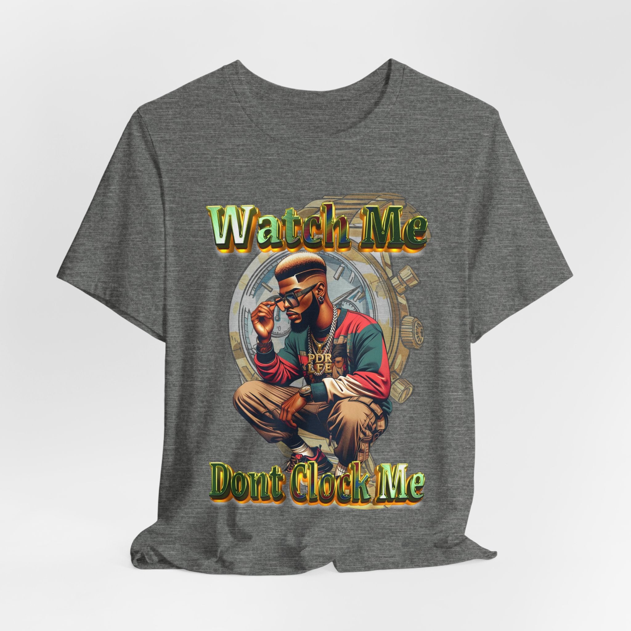This lightweight jersey tee carries attitude and calm confidence. The shirt’s front artwork shows a thoughtful, seated figure layered over a faded clock motif with bold, reggae-toned lettering that reads “Watch Me” above and “Don’t Clock Me” below — a quiet declaration of self-paced progress and quiet resilience. The soft, breathable Airlume combed cotton feels gentle on skin and drapes cleanly, while the ribbed crew neck and side seams keep the silhouette neat. Wear it when you want a casual look that speaks about patience, hustle, and staying true to your rhythm.