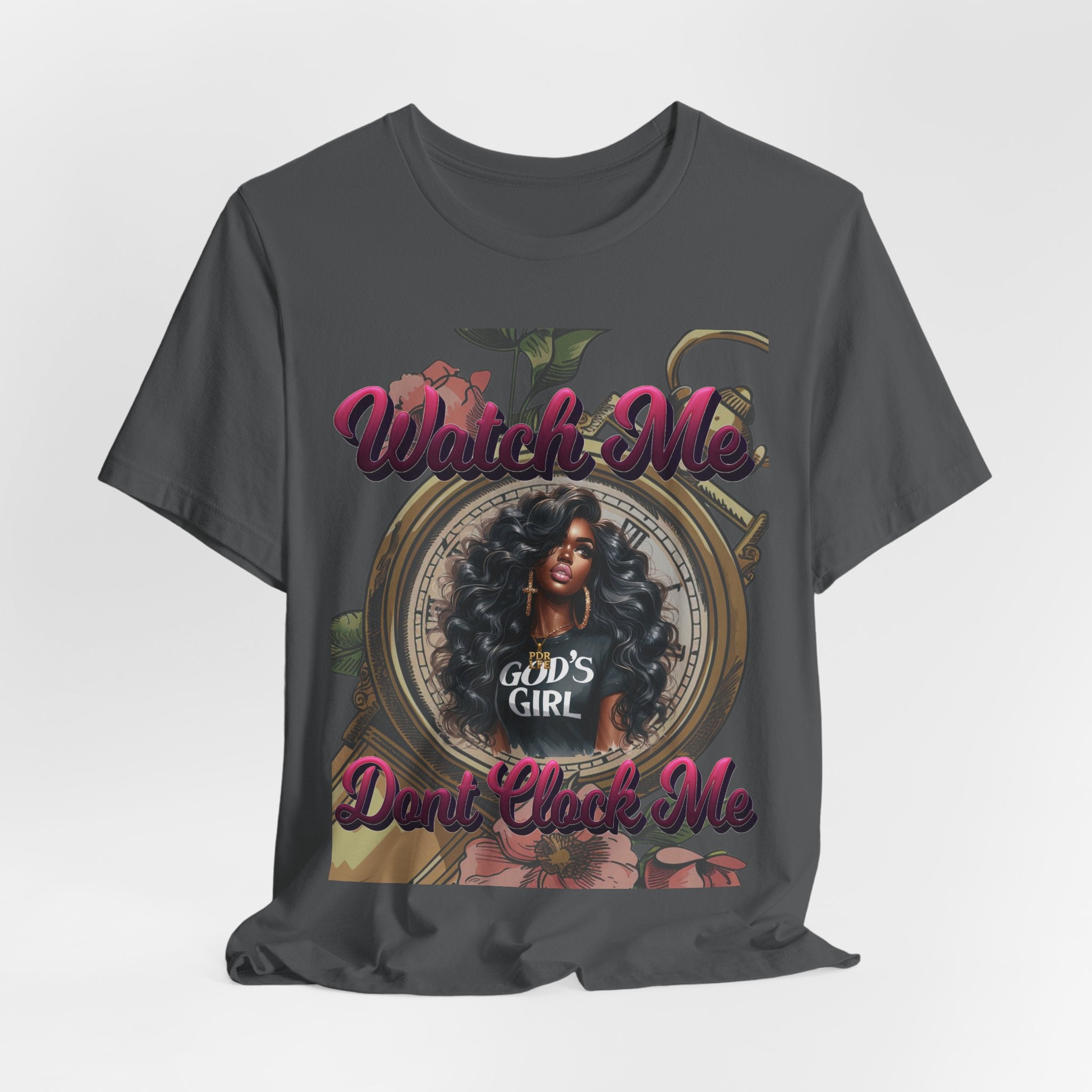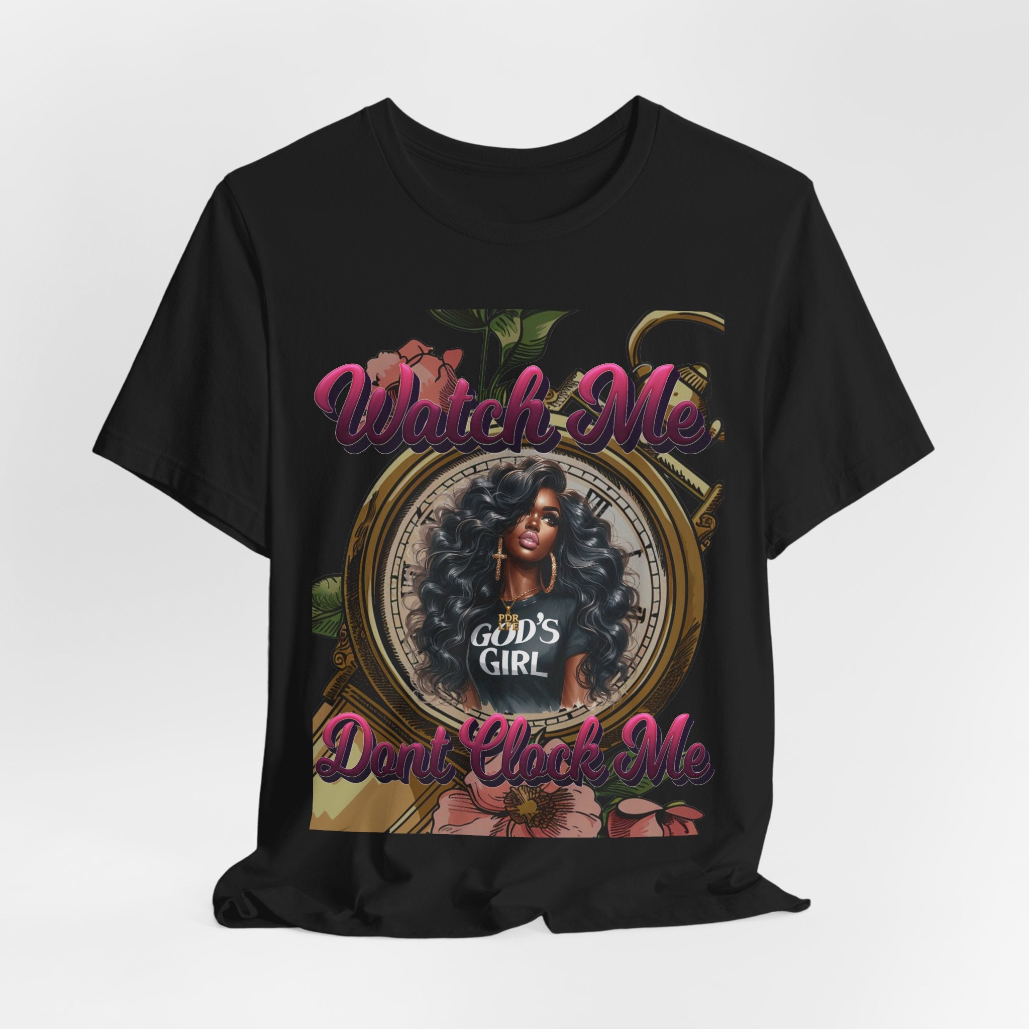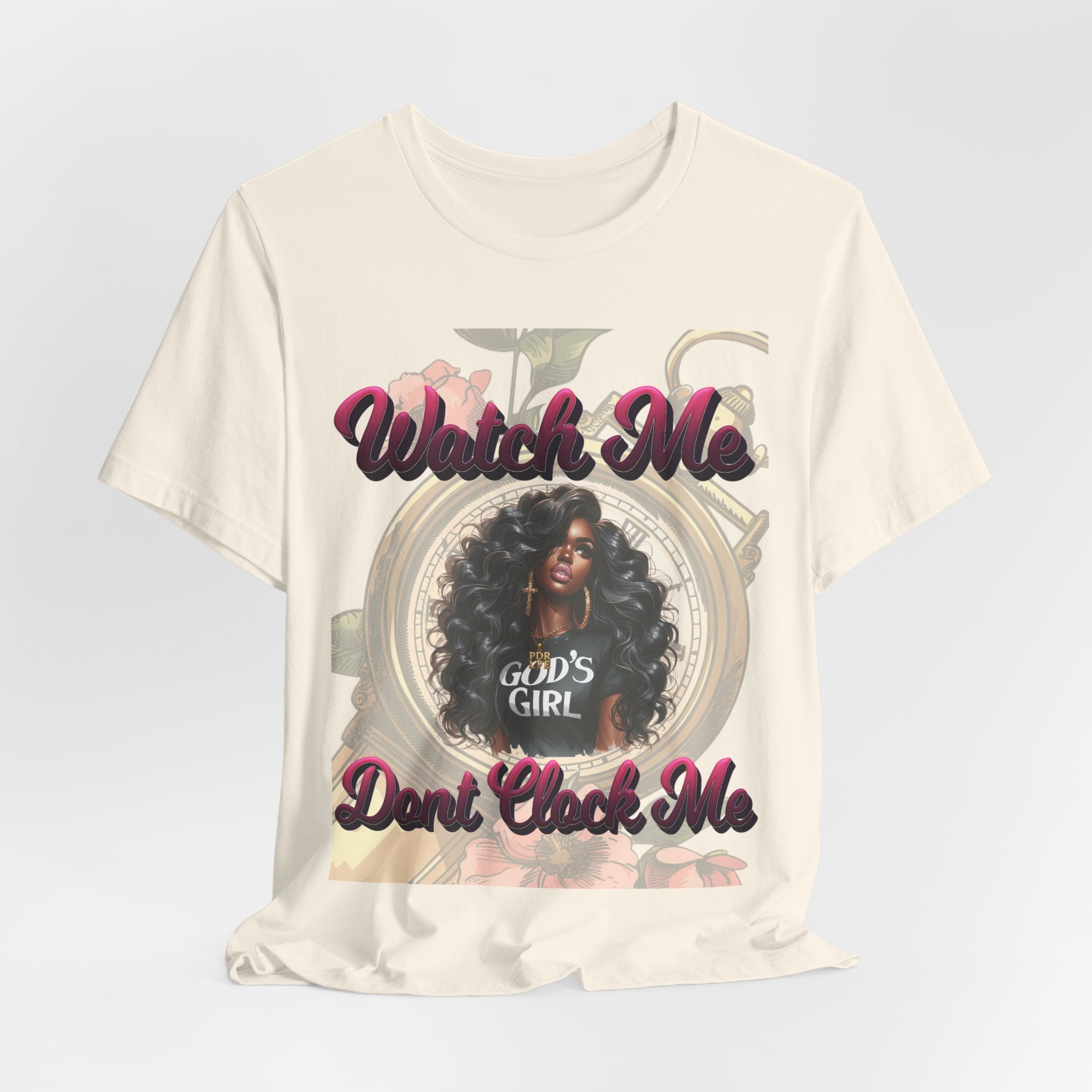 Soft, breathable tee with a confident message — this lightweight jersey shirt sits comfortably against the skin while showcasing bold, feminine artwork. The front print centers on a stylized portrait framed by subtle floral and clock motifs, layered beneath raised-script text that reads a sassy, faith-forward phrase. It wears like a casual staple but reads like a statement: easy to layer, comfortable enough for all-day wear, and detailed enough to spark conversations. The crew neckline and retail fit keep the silhouette clean and wearable; the tear-away label prevents irritation. Ethically produced and REACH certified, this tee mixes everyday comfort with thoughtful design and positive attitude.